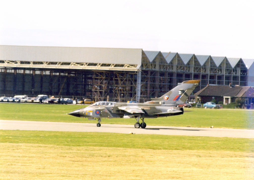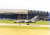 at the end of the runway at Warton with the Tornado final assembly line (302 hangar) under construction in the background.